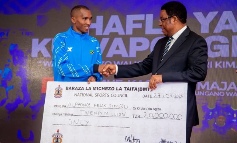 DAR ES SALAAM:WAZIRI Mkuu wa Jamhuri ya Muungano wa Tanzania, Kassim Majaliwa, amemkabidhi hundi ya Sh. Milioni 20 kwa Bingwa wa Dunia wa mbio za Marathon za kilomita 42, Alphonce Felix Simbu, kama zawadi ya kutambua mchango wake mkubwa katika kuipa heshima Tanzania kimataifa.